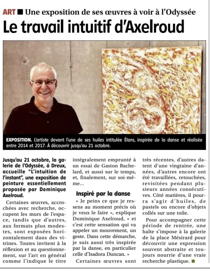 En 1931, Gaston Bachelard publie L’Intuition de l’Instant, un véritable hommage à la pensée et réflection sur le geste créatif. Pour Bachelard, toute vérité passe par un acte de pensée instantanné, qui se reflette dans les actes créatifs. La trace du momentané et l’esprit brut se rejoignent dans les oeuvres de Dominique Axelroud exposées à la Médiathèque de l’Odyssée alliant aquarelles, sculptures, huiles sur toile et croquis.